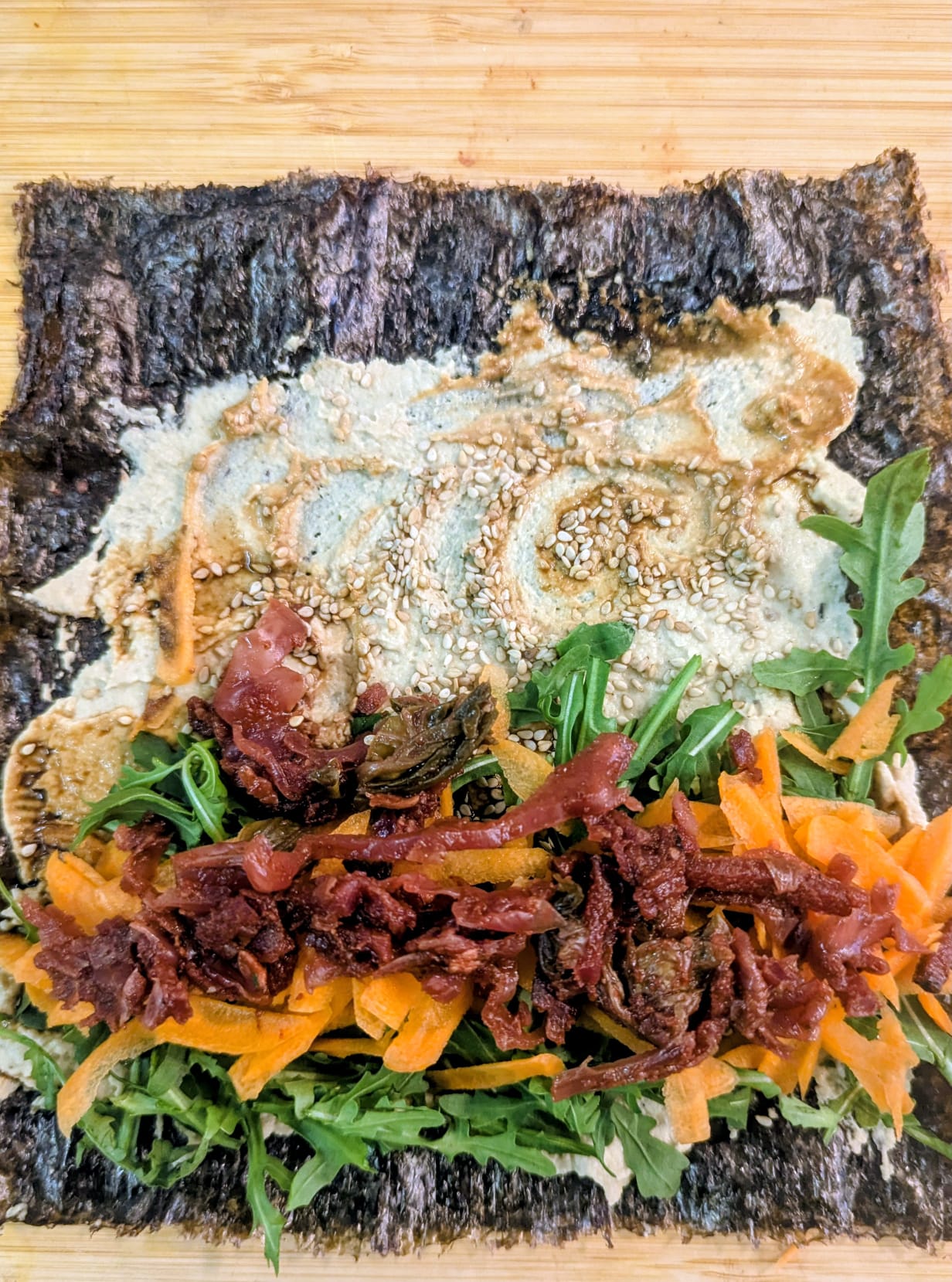 Zeewier zit boordevol mineralen en sporenelementen, terwijl kimchi dankzij fermentatie bijdraagt aan een gezonde darmflora. In combinatie met hummus en knapperige groenten ontstaat een wrap die niet alleen lekker is, maar ook je lichaam actief ondersteunt.